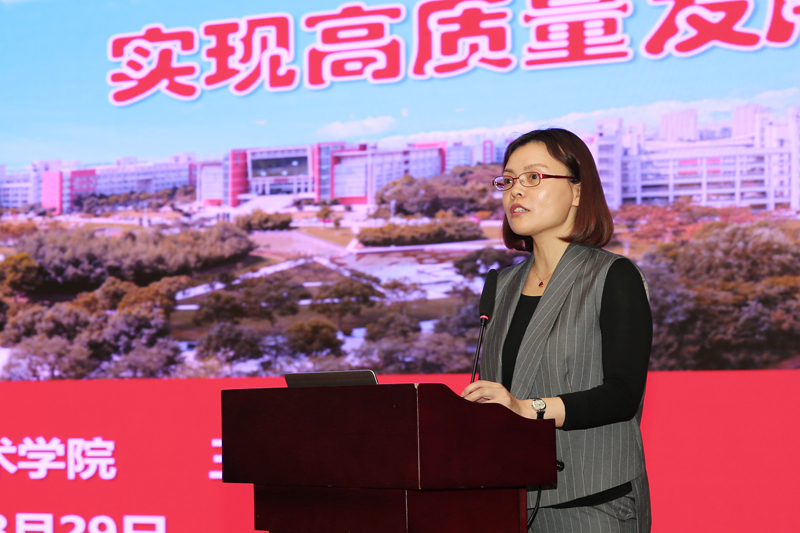 江苏省高等教育学会高职教育研究委员会秘书长、江苏经贸职业技术学院副校长王志凤在《聚焦“双高”建设 实现高质量发展》发言中,围绕学校“大思政、大文化、大融合、大共享、大平台、大贡献”六大思路,从实现“党的建设高质量、立德铸魂高质量、培技育才高质量、师资队伍高质量、社会服务高质量、国际化办学高质量”六个方面,深入阐述了我校“双高计划”建设的任务与目标。