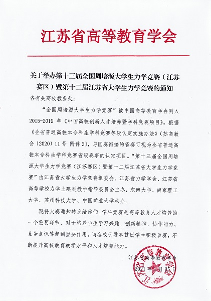 根据“第十三届全国周培源大学生力学竞赛通知”要求,第十三届全国周培源大学生力学竞赛(江苏赛区)暨第十二届江苏省大学生力学竞赛将于2021年5月23日举行,现将有关竞赛事项通知如下: