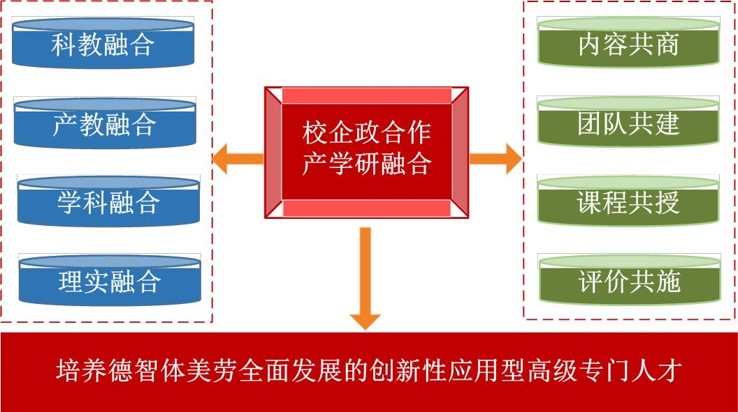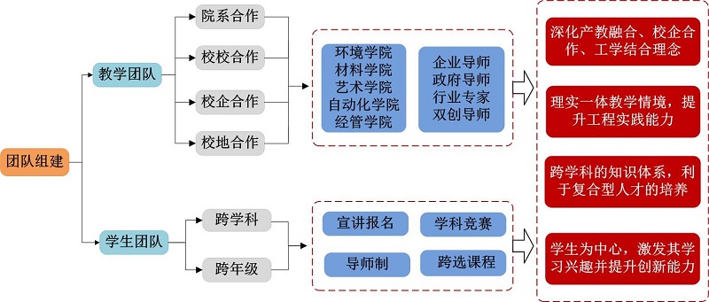 针对产教脱节,四链衔接不紧,学生知识体系不完整等问题,组建校企政深度融合的跨学科教学团队,营造“内容共商、团队共建、课程共授、评价共施”的教学形态,实现理实一体化的教学情景,利于学生实践创新能力的培养。