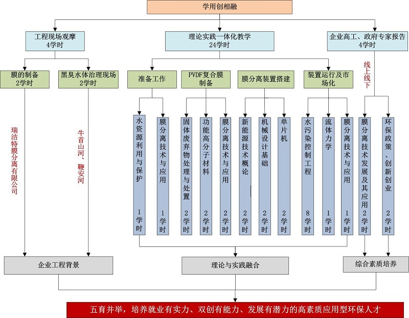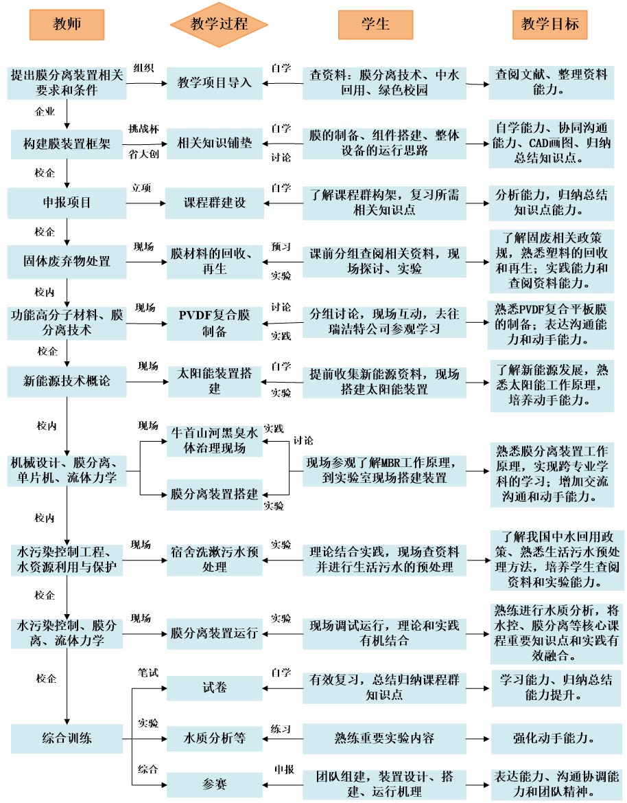 本着优势互补、资源共享、互惠双赢、共同发展的原则,依托产学研技术开发项目,校企政三方搭建科教融合、产教融合、学科融合、理实融合的协同育人平台(图7),共同制订环境工程类项目化教学目标、内容、计划、流程和相关管理制度。“内容共商、团队共建、课程共授、评价共施”的教学形态下,以社会调查、工程实践、实验、专家讲座等教学手段开展项目所涉及的多学科知识点的教学,深化产教融合,校企政协同育人理念,提升学生的工程实践能力和创新能力,培养学生团队协作和职业道德等人文素养。