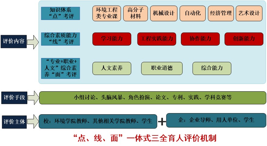 本研究中组建由企业导师、校内老师、用人单位、学生组成的考评小组,采用多样化评价手段对以项目为载体的教学实施中的调查报告、项目策划书、设计说明书、小论文、工程实践等专业技能知识体系进行全方位加权考核。评价权重根据具体考核内容合理分配,如:工程实践能力和职业道德的评价企业导师权重为60%,知识体系和学习能力的评价校内教师权重为60%。通过“自评+互评+他评”方式,构建“点、线、面”一体式的多元化评价机制(图9),实现对学生的“专业、职业、素养”进行科学合理的综合考评,并贯穿学生学习全过程、全方位,形成反馈-改进的闭环评价,促使学生的反思性成长。