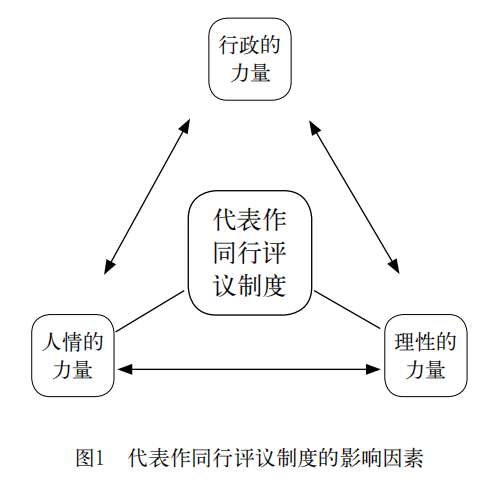 那么,同行评议制度何以如此,其在执行过程中究竟发生了什么?这就需要进行深入的讨论。从社会系统论的角度来看,代表作同行评议制度除了受其内在的学术共同体原则的指引外(更多表现出理性的力量),势必还要受到来自行政管理部门和人情社会之不同力量的作用,各种力量相互交织,特别是行政力量和人情力量的叠加效应,使得基于理性和价值规范的同行的力量边缘化、形式化,最终形塑了当下的同行评议制度(见图1)。