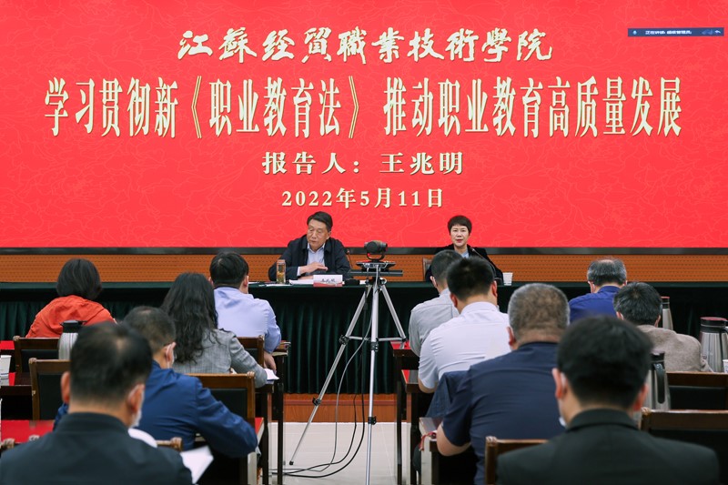 2.新《职业教育法》宣讲学习,依法治校促事业高质量发展。新《职业教育法》对于我国职业教育发展具有里程碑式的重大意义,为开创新时代职业教育依法治理的新局面打下了坚实基础。为深入学习、准确理解、贯彻落实新《职业教育法》,学校于5月11日下午举办新《职业教育法》学习宣讲活动。本次活动邀请江苏现代职业教育研究院副理事长王兆明宣讲解读,学校校领导、中层干部及师生1000多人通过线上线下相结合的方式参与了学习。