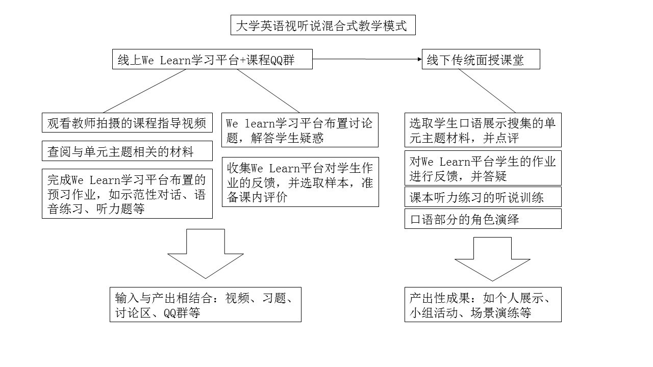 近年来,文秋芳教授提出了“产出导向法”(Production Oriented Approach, 简称为POA)理念,这一理念为大学英语的教学改革提供了新的探索思路和方法。该理念旨在解决大学外语教学中“学用分离”的难题,强调“产出性运用”教学目标的实现,从而激发学生学习的能动性、自信心和学习的兴趣。通过改变以教材、教师为中心的教学方式方法,将“输入性学习”与“产出性运用”相结合,从而达到更有效的教学效果(文秋芳,2015)。而线上线下混合式教学模式为这一改革新思路提供了技术手段和信息保障,它融合了传统课堂和在线教育的优势,但是可以提供比单一的教学模式参与度更高的学习体验(Garrison & Vaughan,2008),线上线下的混合式教学是以学生为中心,激发学生自主学习的能力,并且通过在线平台提供给学生提供更多的读和说的“产出性”学习场景和体验,使学生成为学习体验的主导者。尤其是一些学习场景需要合作完成时,学生可以成为学习活动的参加者、组织者和协调者,由此激发他们学习的创造性,激起学习的兴趣,从而达到以用促学、学以致用的目的。