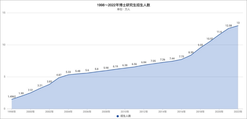 1996年超过韩国、2000年超过印度、2002年超过英国和日本、2005年超过德国。与美国国家教育统计中心公布的美国博士生教育最新数据相比,目前我国学术学位博士生(Ph.D.)规模已超过美国,排世界第一,全口径博士生总规模排世界第二,与我国经济体量(GDP)、研发经费(R&D)在全球排名情况基本匹配。国内数据来看,随着硕士研究生的扩招风潮,博士招生在2017年后便进入快车道发展,每年增幅都维持在10%左右,2022年博士研究生招生人数首次突破13万人次,2022年9月份之后我国在读博士或将达到56万-57万之间。