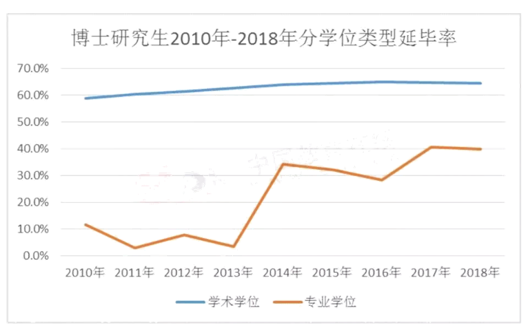 延期毕业的问题也同样不容忽视,近年来我国博士研究生的延期毕业率持续上升,延期毕业逐渐成为常态化现象。2003年博士研究生延毕率约46.5%,在2012年延毕率突破60%后仍不断上升,到2018年延毕率已达到64%,说明有超过六成的博士研究生无法正常毕业。而且学术学位博士研究生的延毕率远高于专业学位博士延毕率。从2010年至2018年,学术学位博士延毕率保持在将近60%以上,而专业学位博士延毕率最高在2017年达到40.7%。其中,受2009年专业学位研究生全面招生等因素的影响,专业学位博士延毕率从2013年的近3.6%直升到2014年的34.1%。