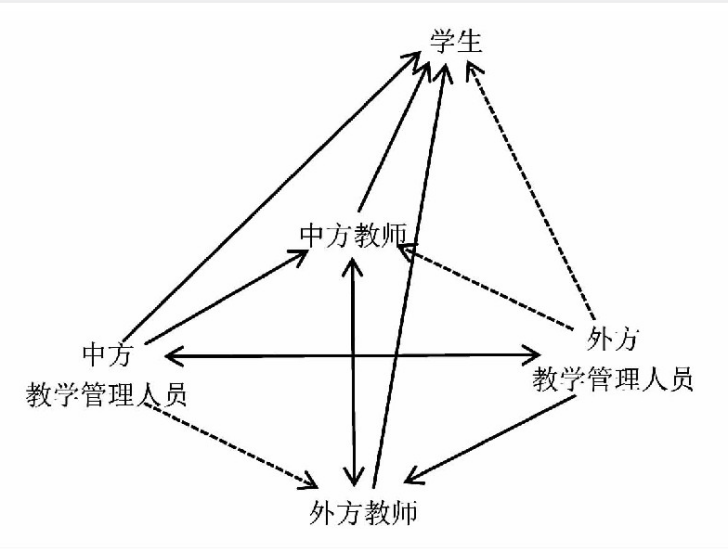 如图1所示,学生、中外方教师及中外方教学管理人员建立了两两相互联结。其中,外方管理人员不直接面向学生和中方教师,中方管理人员不直接面向外方教师。但在技术层面,上述各方仍然存在建立联系的通道,因此在图中用虚线描绘相关连结。