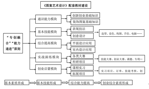 教材是课程建设的载体。“专创融合”教育不仅体现在课程体系中,更要渗透到每一门课程及配套的专业教材中,这是提高创新创业人才培养质量的关键。但目前,各高校尚无统一、科学的“专创融合”配套的专业教材。为贯彻落实国务院办公厅发布的《关于深化高等学校创新创业教育改革的实施意见》和《教育部关于职业院校教材管理办法》文件精神,课题研发了特色教材《装饰图案创新训练教程》。该教材是“专创融合”课程《图案艺术设计》的配套教材,为打破传统的“专业知识结构”体系,教材以创新创业“能力递进式”培养为主线设置五大模块,在每个模块建设和各个教学环节中植入“创新创业”意识的种子。模块一:“通识能力(基本知识+创新思维培养)”; 模块二:“基本技能训练(创意设计+创新表现)”; 模块三:“创新能力提高训练(创新应用+拓展)”;模块四:“专业技能实战演练(技能大赛+课程实习)”;模块五:“创新创业实践启动(创业启蒙+体验)”。教材形成系统的“专业教育”与“职业教育、创新创业教育”的融合,实现了“双创”教育在人才培养过程的全覆盖,解决了“专创融合”教育的关键载体缺乏的问题。(如下图“专创融合”配套教材结构图)