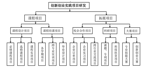 平台是落实“双创”教育的基础,项目是保障“双创”教育能落实到实处的途径。为凸显“专创融合”“育训结合”的改革理念,依托平台开发实践项目:如“单项技能训练项目”“创新创意设计实训项目”“综合应用拓展实训项目”“专创融合实战演练项目”“设计与管理训练项目” “创新创业实战项目”等,项目顺序是一个由简单到复杂、由基础到拓展、由单一到综合的循序渐进的“能力递进”式的培养路径,以利于学生实际操作技能的掌握和创新创业能力的培养,借以促进“专创融合”的实质性进展,为真正实现“专创融合”打通“最后一公里”。(如下图:创新创业实践项目研发图)