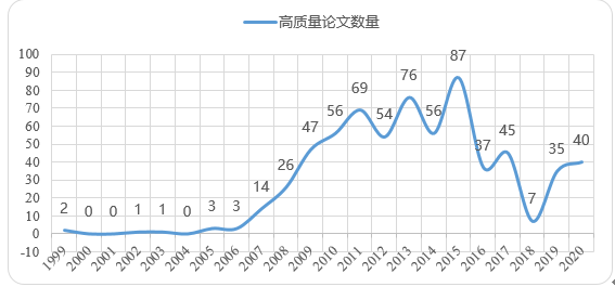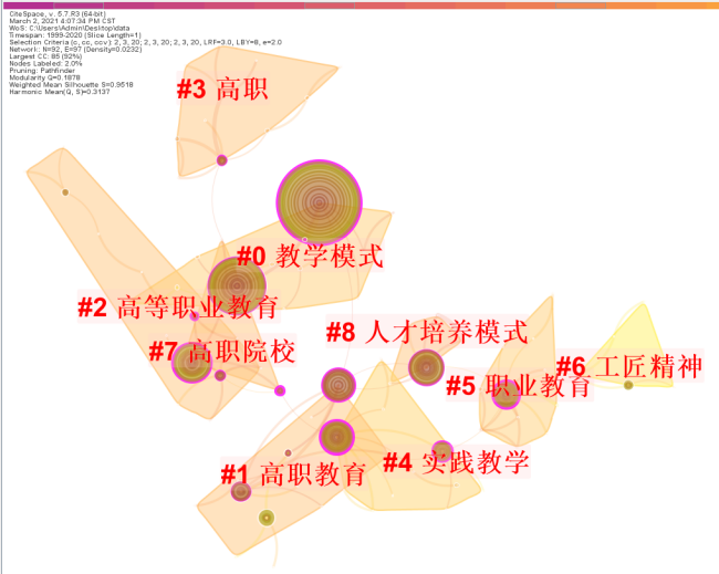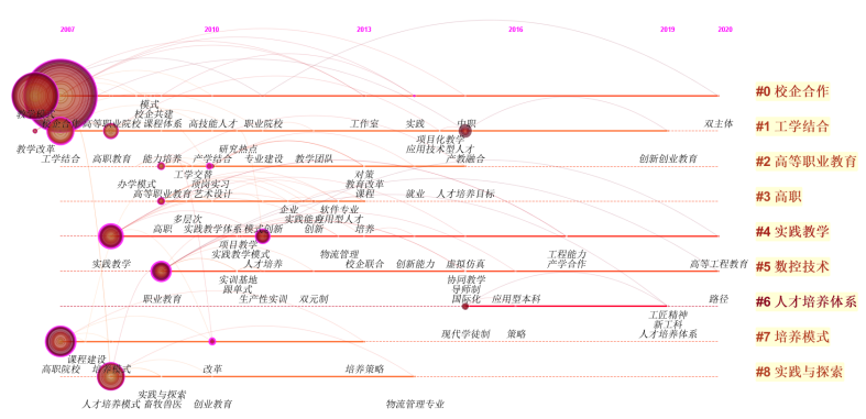 主要成果:通过中国知网(CNKI)1999~2020年产教融合教学模式相关文献数据为基础,利用CiteSpace研究工具,从研究进展、研究机构分布、论文期刊分布、研究热点与演变趋势等方面分析了目前产教融合教学模式的进展情况,研究结果发现:(1)产教融合教学模式相关领域的研究经历了爆发期和平稳期。但在2016年后,随着研究的不断深入和研究范围的不断扩大,高质量文献和高水平研究成果却在减少。(2)研究的主体集中在职业技术学院,机构之间缺乏必要的合作,联系不够紧密,极大地制约了相关领域的发展;本科院校产教融合教学模式相关领域的研究起步较晚,发文量不多,研究的内容有相对的滞后性,研究的广度和深度还有待进一步提高。(3)从已公开发表的文献看,实践教学的实施没有完全摆脱传统的理论教育主导模式,其实施过程及成效有待进一步提高;校企合作人才培养深层次融合度有待进一步加深。(4)对于一些思辨性的经验性研究的学者,其研究内容主要集中在制定国家政策法律和构建机制体制等方面,缺乏对相关领域研究的现状、演变趋势等分析;对于一些实证研究的学者,其分析方法也略有不足,无法提出更具针对性和可操作性的建议,相关研究仍然滞后于国外。具体研究结果如下图所示。
