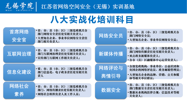 近两年来,开展面向企事业单位网络安全管理人员及专业技术人员,网络安全从业人员、自媒体从业人员等,开展网络安全技能提升培训,为全市、全省乃至全国网信工作提供人才储备和智力支撑,有力推动网络空间安全事业的发展。主要围绕“首席网络安全官培、网络安全员、网络评论与舆情引导、新媒体传播、网络社会素养、互联网治理、数据安全、信息化建设”8大方向,设计培训课程方案。目前,已开展中央网信办、省委网信办、省司法厅各类培训班21期,参训2200余人次,开展省市应急演练活动及承办省市高质量网络安全技能大赛等,受到中央、省委、市委网信办的高度重视和支持,得到国家计算机与信息安全管理中心江苏分中心、公安部第三研究所、杭州安恒公司等认可,共同为致力于为国家培养政治站位高、技术能力高的网络安全人才。同时,为无锡市网络安全人才培养和安全产业发展注入了强大动力,具有较好的经济社会效益、广泛的应用基础和社会影响力。
