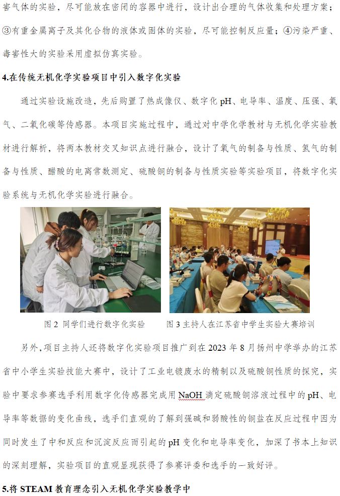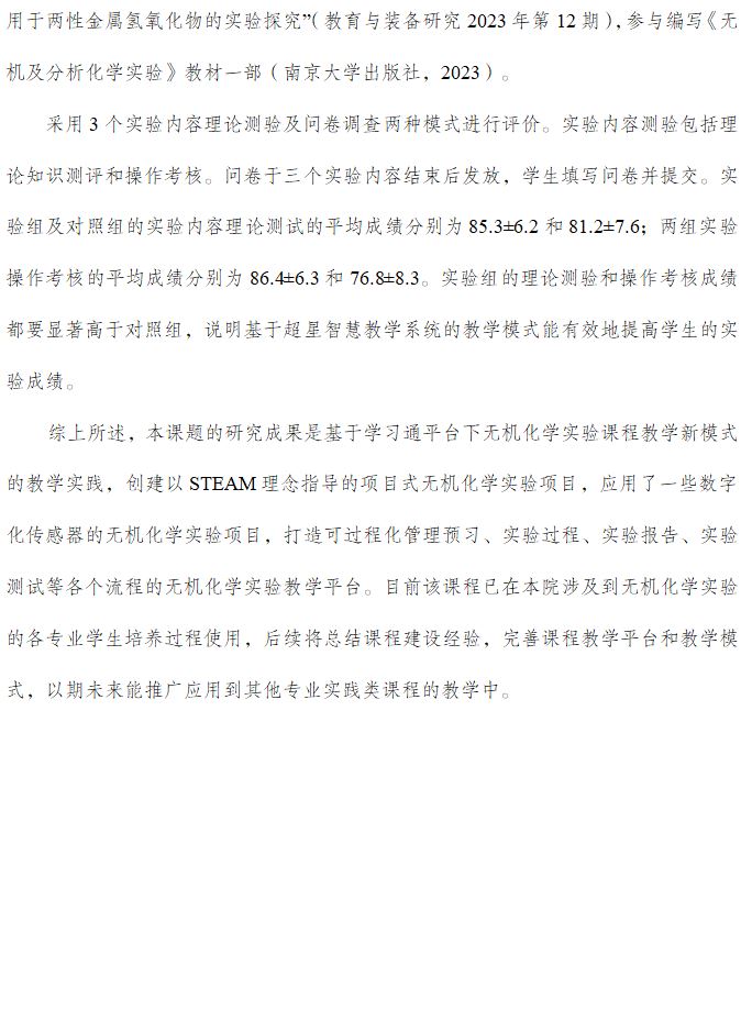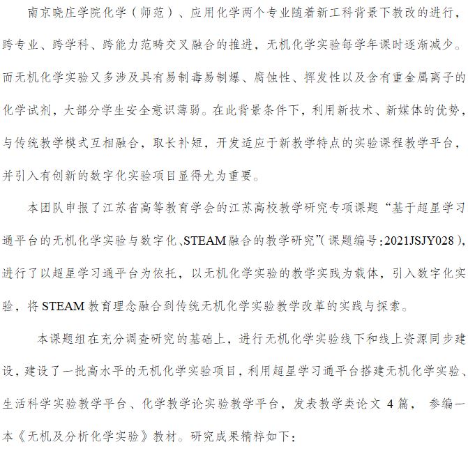 南京晓庄学院王小锋/郎雷鸣 主持完成了2021年江苏高校“教学研究工作”专项课题“基于超星学习通平台的无机化学实验与数字化、STEAM融合的教学研究”(课题编号:2021JSJY028),课题组主要成员:程炯佳、刘少贤、赵继阳、石翛然、潘兆瑞、郑波、邵阳。