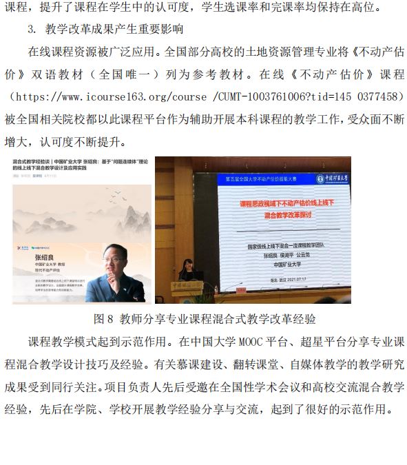 江苏省高校教学研究工作委员会(中国矿业大学)侯湖平/张绍良 主持完成了2021年江苏高校“教学研究工作”专项课题“基于混合式课程建设及其教学改革实践”(课题编号:2021JSJY014),课题组主要成员:米家鑫、公云龙、丁忠义 、杨永均。