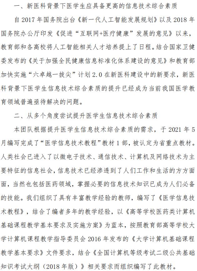 徐州医科大学刘伟/孟晓静 主持完成了2020年江苏高校“大学素质教育与数字化课程建设”专项课题“医学生信息技术综合素质提升策略研究”(课题编号:2020JDKT040),课题组主要成员:朱婷婷、张红伟、吕恩辉、郝杰。