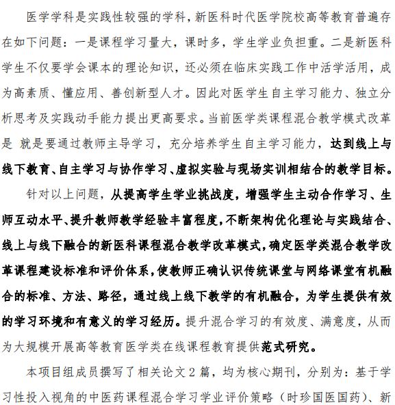 江苏省高校教学研究工作委员会(南京中医药大学)陈明 主持完成了2021年江苏高校“教学研究工作”专项课题(课题编号:2021JSJY011),课题组主要成员:徐桂华、牛浩、仇云龙、戴建国、谷巍、贾静、李莉