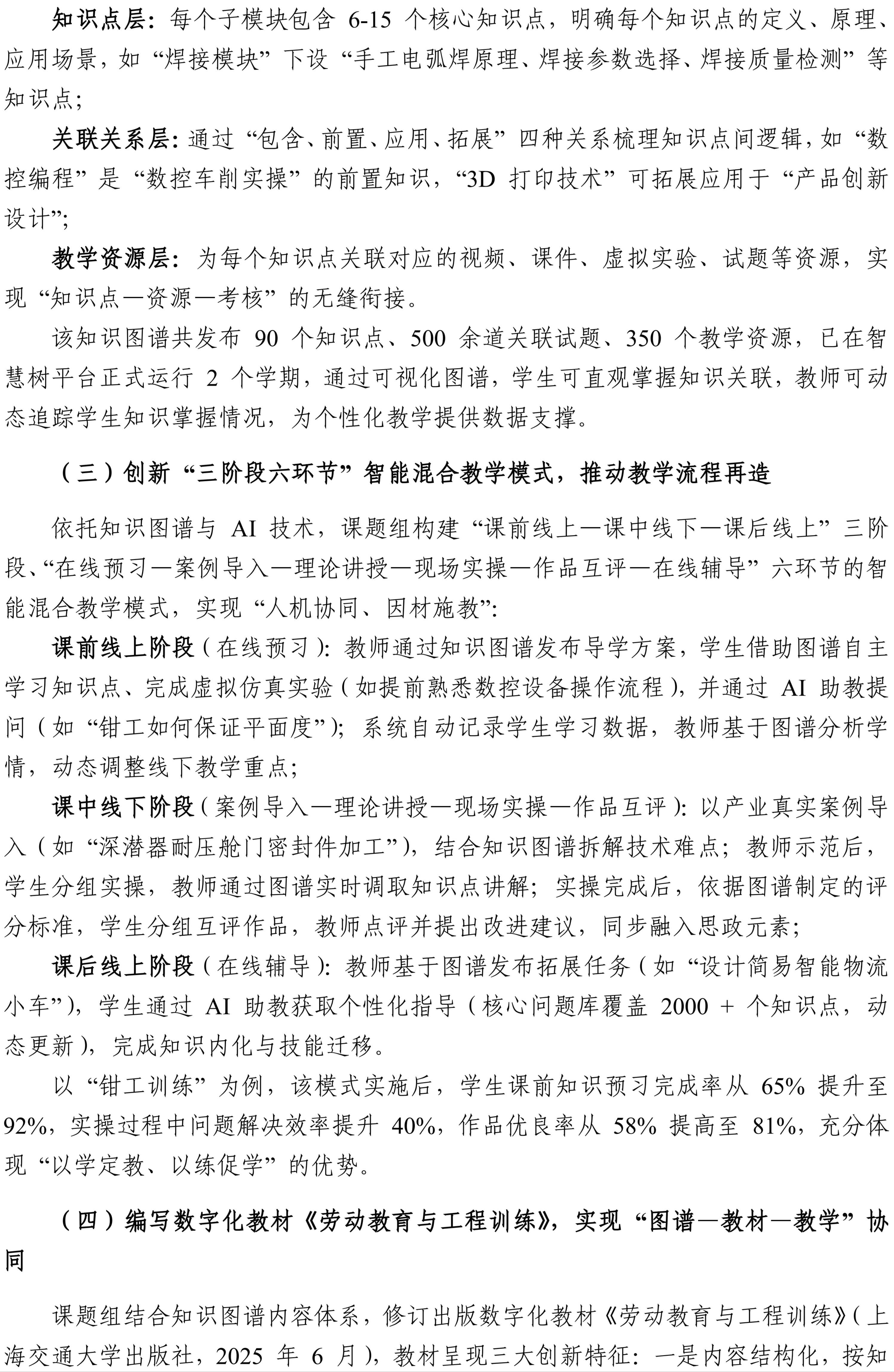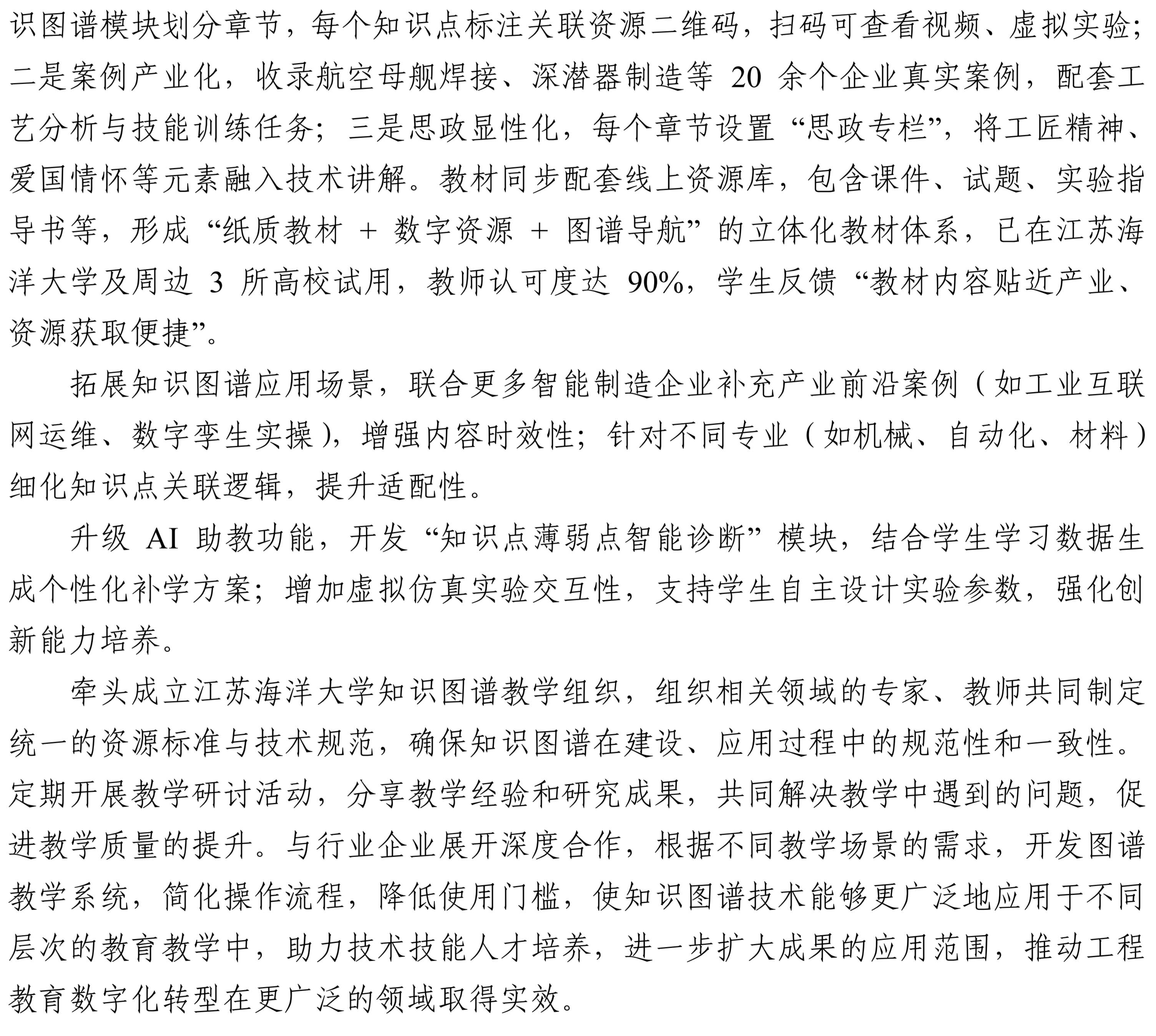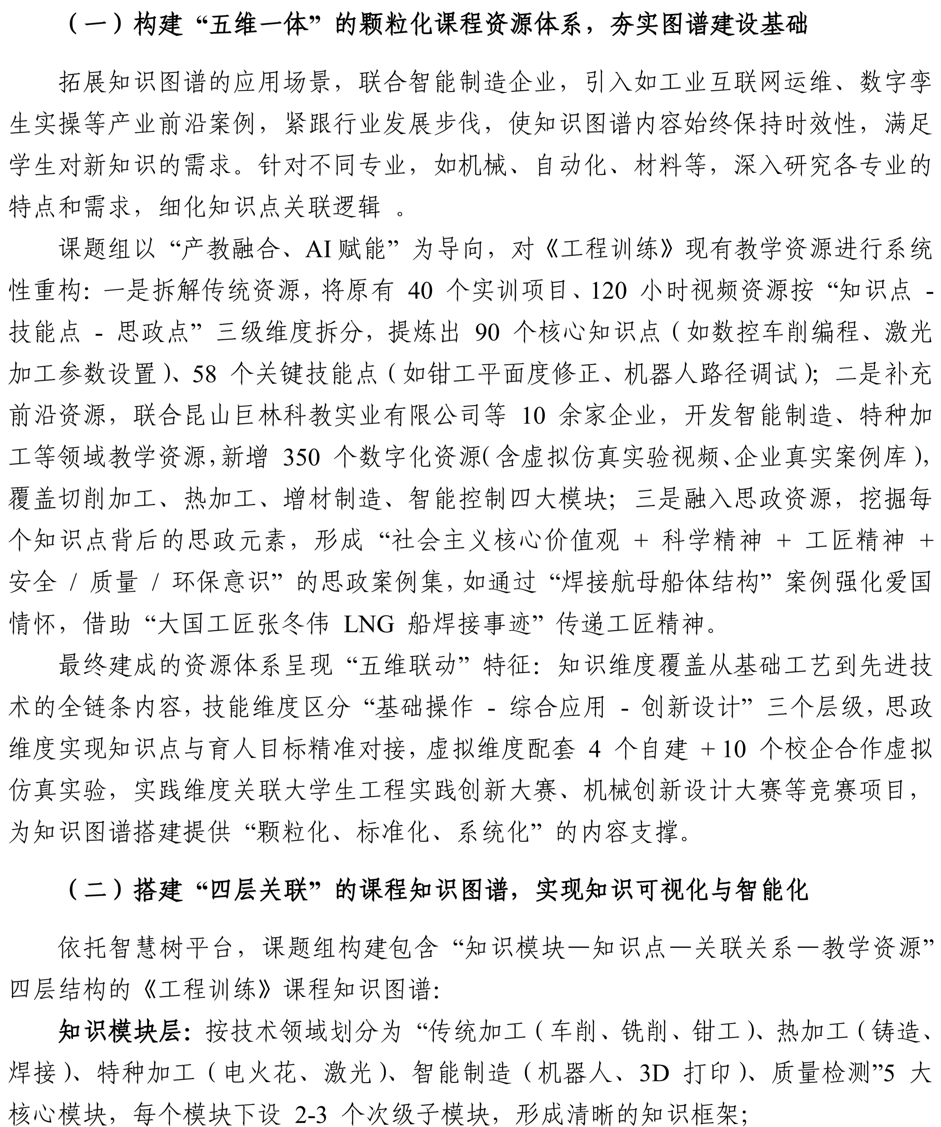 江苏海洋大学陈劲松、张鹏主持完成了2024年江苏省高校“新时代教材数字化建设研究”专项课题“基于知识图谱的《工程训练》课程与教材建设及教学模式研究”(课题编号:2024JCSZ10),课题组主要成员:金孝红、王其兵、徐 苏、岳桂林、杨瑞军、雷晓、钱小磊